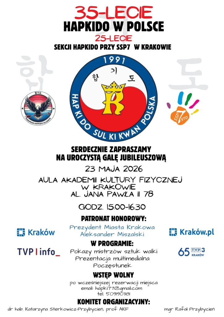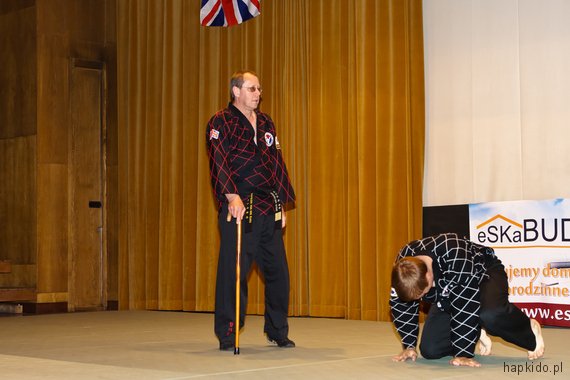 W dniach 27.03 – 3.04 mieliśmy przyjemność gościć w naszym dojang prezydenta European Hapkido Alliance GM Sama Plumba, zaproszonego do Polski przez naszych trenerów. Celem wizyty było przeprowadzenie egzaminu na stopień 1 DAN. Odbyly się również dwa specjalne treningi, podczas których najwyższe stopnie mogły liczyć na wskazówki dotyczące wykonania wymaganych technik. Doskonalone były na nich również techniki z wykorzystaniem broni takiej jak krótki kijek, długi kij czy miecz. W sobotę 29.03 GM Sam Plumb przeprowadził seminarium, podczas którego razem z naszymi uczniami trenowali przedstawiciele sekcji Farang Mu Sul z Wrocławia prowadzonej przez Mistrzynię Katarzynę Furdynę. W przyjaznej atmosferze wspólnie ćwiczyliśmy kopnięcia, uderzenia, techniki obrony przez nożem, a także elementy formy z długim kijem. We wtorek (01.04) przeprowadzony został egzamin, który pomyślnie zdali wszyscy kandydaci ubiegający się o pierwszy stopień mistrzowski: Natalia Przybycień, Krzysztof Figiel i Andrzej Milenin. Podczas swojego pobytu mistrz miał również okazję zwiedzić interesujące zakątki Krakowa i odwiedzić zoo. Wizyta zakończyła się kolacją, podczas której uczciliśmy 35 lat istnienia European Hapkido Alliance. Bardzo dziękujemy GM Samowi Plumbowi za odwiedziny, cenne wskazówki przekazane nam w trakcie treningów, a także za przeprowadzenie egzaminu.